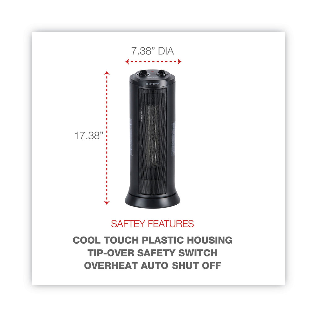 The oscillating mini tower heater delivers heat where you need it. Air is warmed as it passes over a large ceramic and aluminum heating element, and heat is dispersed by a powerful fan. Adjustable thermostat up to 1500-watt heating output for maximum comfort. Designed with safety in mind with overheat auto-shut off protection, tip-over safety switch, and a cool-to-the-touch plastic housing. Heater Type: Ceramic Convection; Safety Features: Cool Touch Plastic Housing; Safety Overheat Protection with Auto Shut-Off; Setting Range [Min]: 900 W; Setting Range [Max]: 1,500 W.
